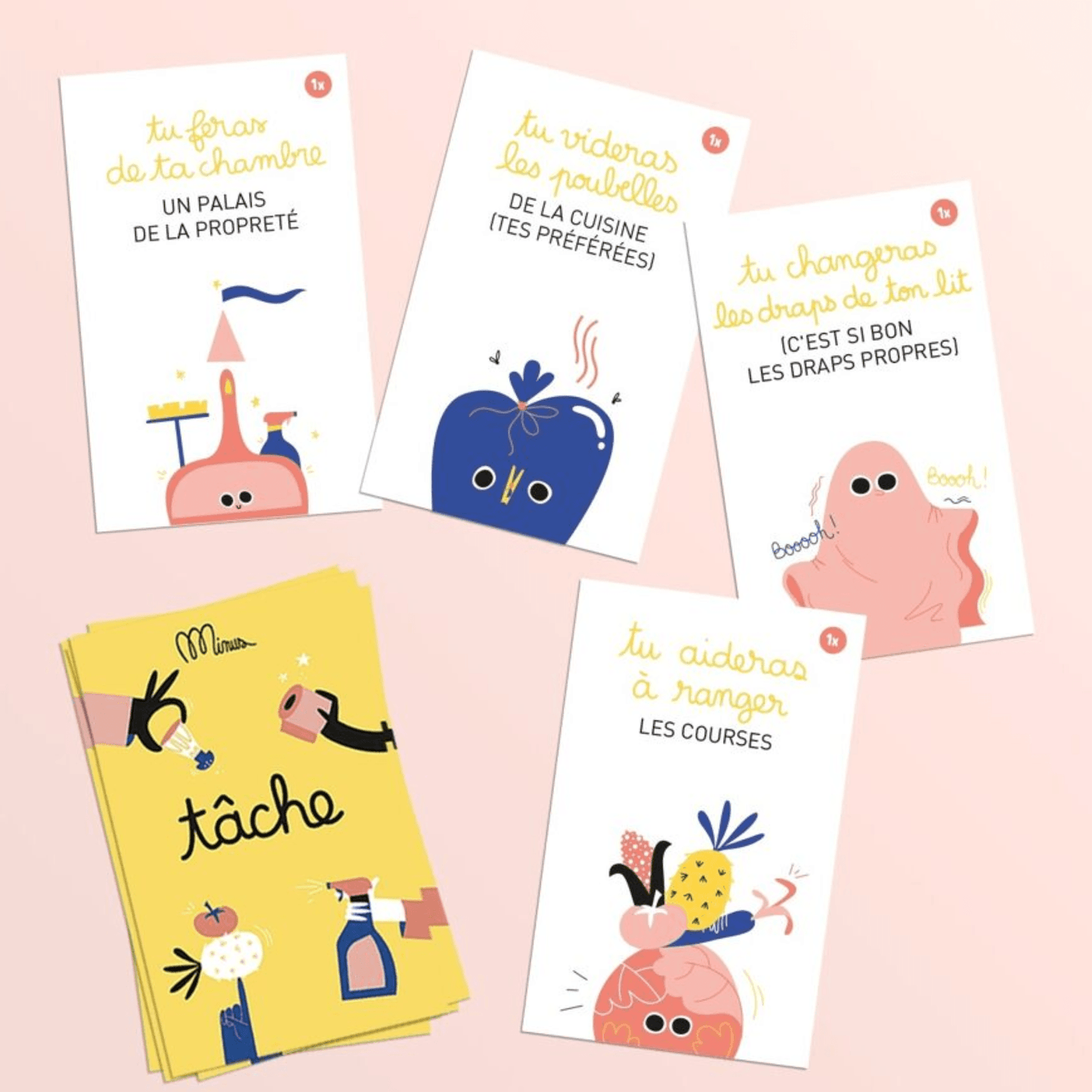 Le principe est simple : chaque enfant tire une carte "tâche" qui lui indique une mission à accomplir (comme ranger sa chambre, mettre la table ou arroser les plantes). Une fois la tâche accomplie, il peut passer à l’étape suivante : tirer une carte "défi". Ces cartes ajoutent un aspect amusant et compétitif en proposant des petits challenges comme "réaliser la tâche en moins de 5 minutes", "effectuer la tâche en dansant" ou "avec une seule main" !